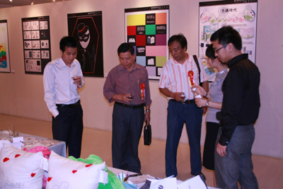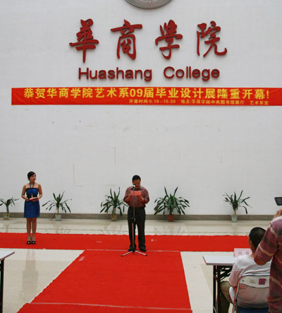 5月19日下午,广东商学院华商学院艺术系在学院中央图书馆一楼大厅隆重举行2009届毕业生毕业设计展开幕式。现场特邀了华南师范大学艺术学院程新浩副院长、广东教育学院艺术系陈渐副主任、华南农业大学艺术学院环境艺术系郑欣主任、博奥司企业设计有限公司总裁等以及学院丘兆福副院长、邓基泽副院长、艺术系刘源主任参加。邓基泽副院长为开幕式致辞,随后现场举行剪彩仪式,正式拉开了此次毕业设计展的序幕。