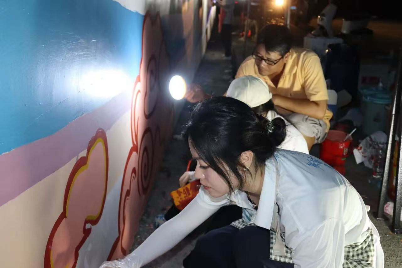 华创匠心先锋队的队员们依据安排,有序进行舞龙主题的墙体绘画。随着时间的推移,龙头部分色块完善龙身龙尾部分以基本完成。队员们对已完成的部分进行了细致的微调力求让舞龙更加完美,让作品的进程更迅速,力求让舞龙墙绘作品能够最大程度地贴合当地文化特色与群众需求。