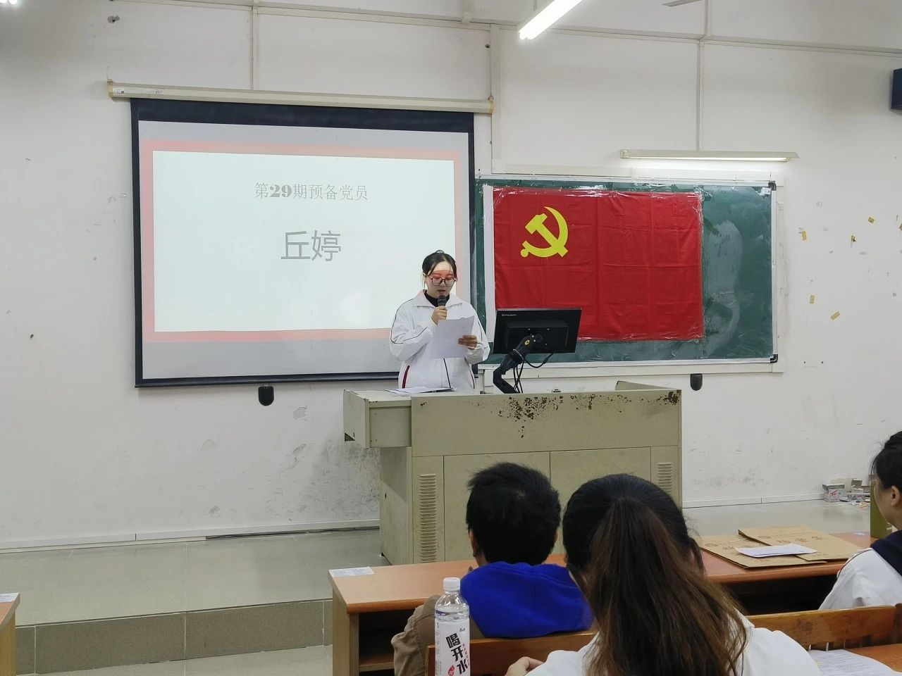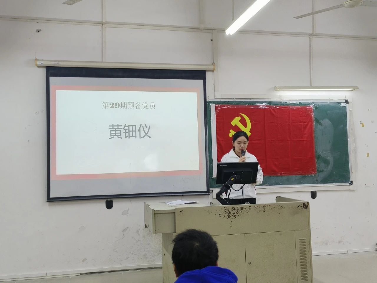 预备党员戚盈富、黄钿仪、丘婷、黄佳琪同志依次上台,宣读转正申请书,汇报预备期间的思想、学习和工作方面的情况和不足之处,进行自我评价,提出改进方式,表明自己迫切入党的心情,认真对待转正的态度和今后更加努力的决心。在今后的学习工作中,也会继续努力,坚定共产主义理想信念,加强政治理论学习。各入党介绍人根据预备党员的汇报情况和一年预备期的表现进行民主评议,并指出改进方向。