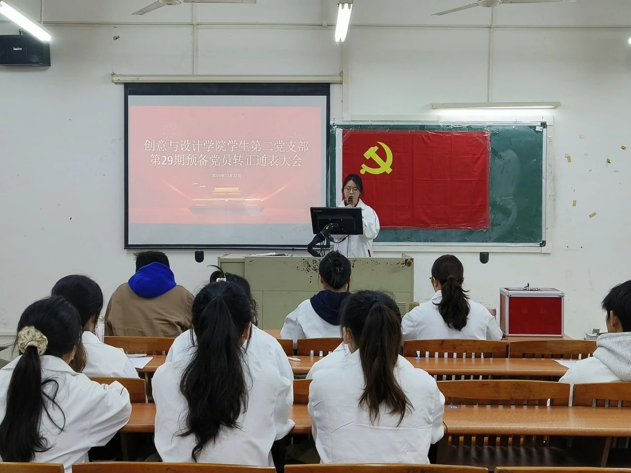 2024年12月23日中午12:20分,创意与设计学院学生第二党支部于厚德楼C208举行第29期预备党员转正大会。出席本次大会的有创意与设计学院学生党支部书记郑金明老师、创意与设计学院学生党支部各部门工作人员、创意与设计学院学生党支部全体正式党员与预备党员。本次会议由党支部工作人员吕凯珊同志主持。