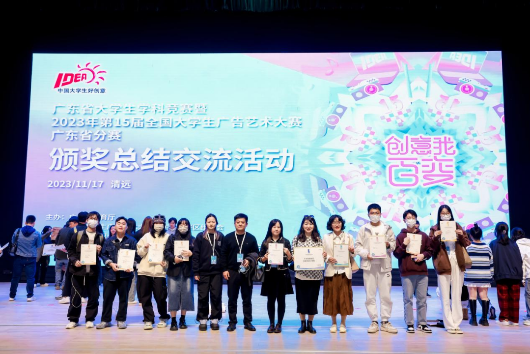 202311,正值金秋,15届大广赛学科竞赛省级、国家级成果展示盛典圆满落幕。我校创意与设计学院副院长杨磊、艺术创作与研究中心主任李明、优秀指导教师代表袁凤、文佩、乔磊及获奖学生代表参加了第十五届全国大学生广告艺术大赛广东省赛区颁奖典礼。