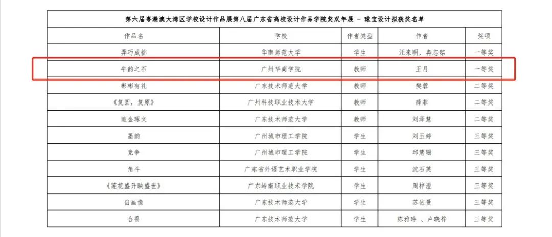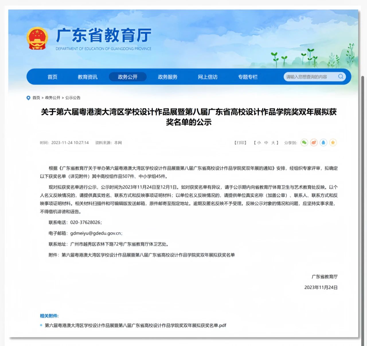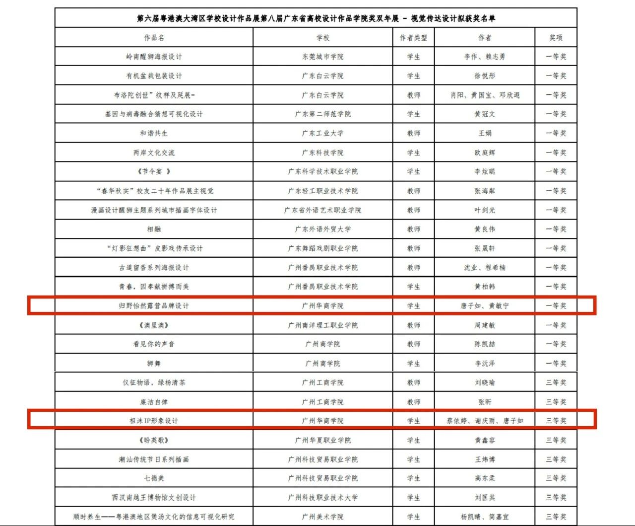 近日,由广东省教育厅举主办的第六届粤港澳大湾区学校设计作品展暨第八届广东省高校设计作品学院奖双年展拟获奖名单于2023年11月24日公布。广州华商学院师生们积极参赛,再创佳绩!