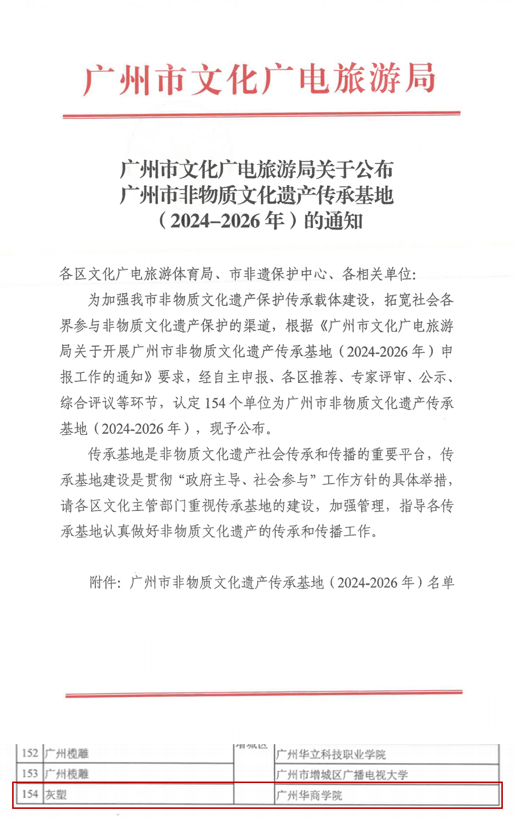 近日,广州市文化广电旅游局公布了《广州市文化广电旅游局关于公布广州市非物质文化遗产传承基地(2024-2026年)的通知,经自主申报、各区推荐、专家评审、公示综合评议等环节,我校荣幸地被认定为广州市非物质文化遗产传承基地(2024-2026年),这是我校首次获批非遗传承基地,是我校在非遗文化传承工作中取得的一次重大进展。