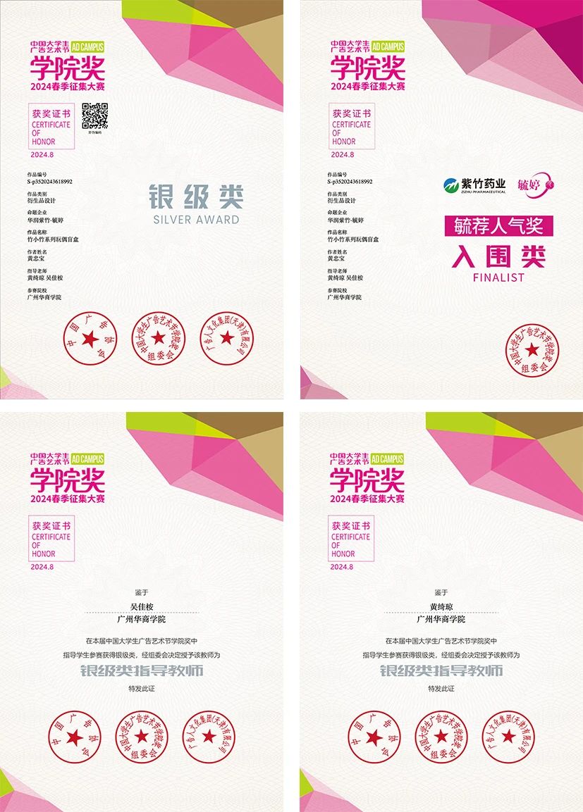 在 2024 年中国大学生广告艺术节学院奖春季赛中,黄绮琼、吴佳桉老师便已荣获银级类指导教师,其指导的视觉传达2021级学生黄忠宝的衍生品设计作品《竹小竹系列玩偶盲盒》也成功斩获银奖。此次秋季赛的佳绩更是锦上添花,充分展现出该专业在学科竞赛领域的深厚底蕴与卓越成效。