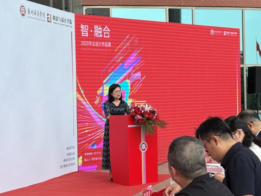 广州华商学院党委书记陈玉欢上台致辞。她首先祝贺创意与设计学院2025届毕业设计作品展顺利开幕。接着,陈书记肯定了学院教育理念及教学成果,点赞 “智・融合” 主题彰显的创新精神,希望毕业生牢记校训、勇于实践、创造美好未来,预祝展览圆满成功、毕业生前程似锦,为社会创造更多的价值。