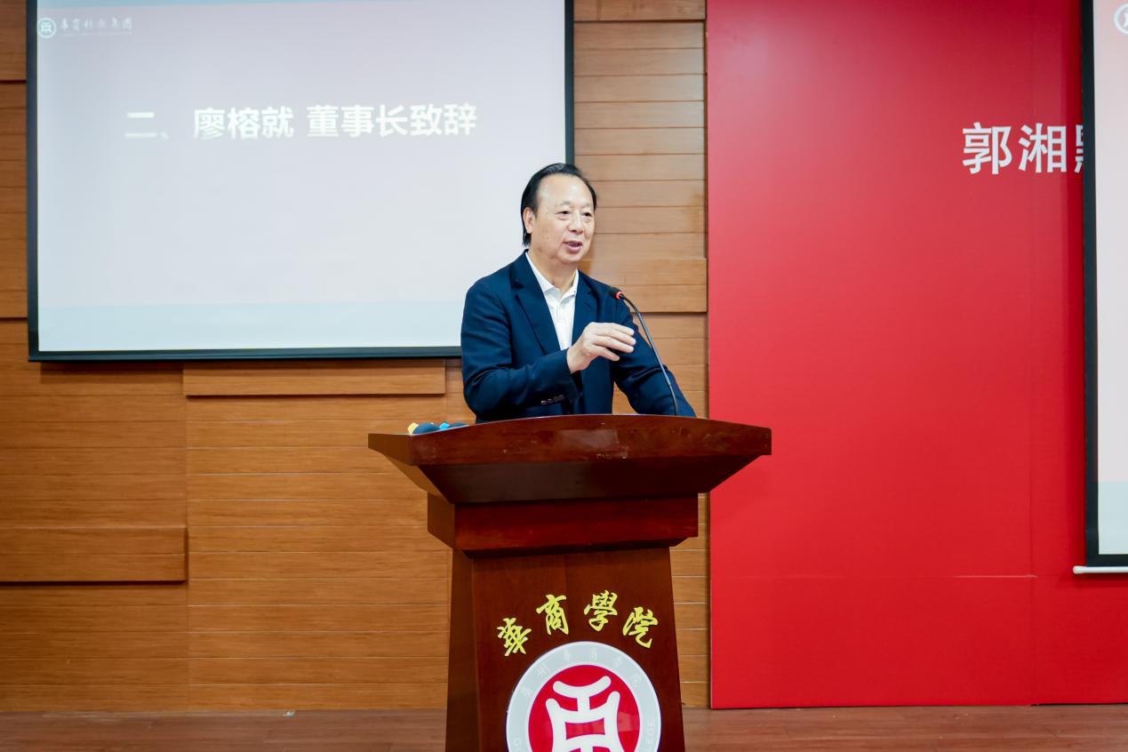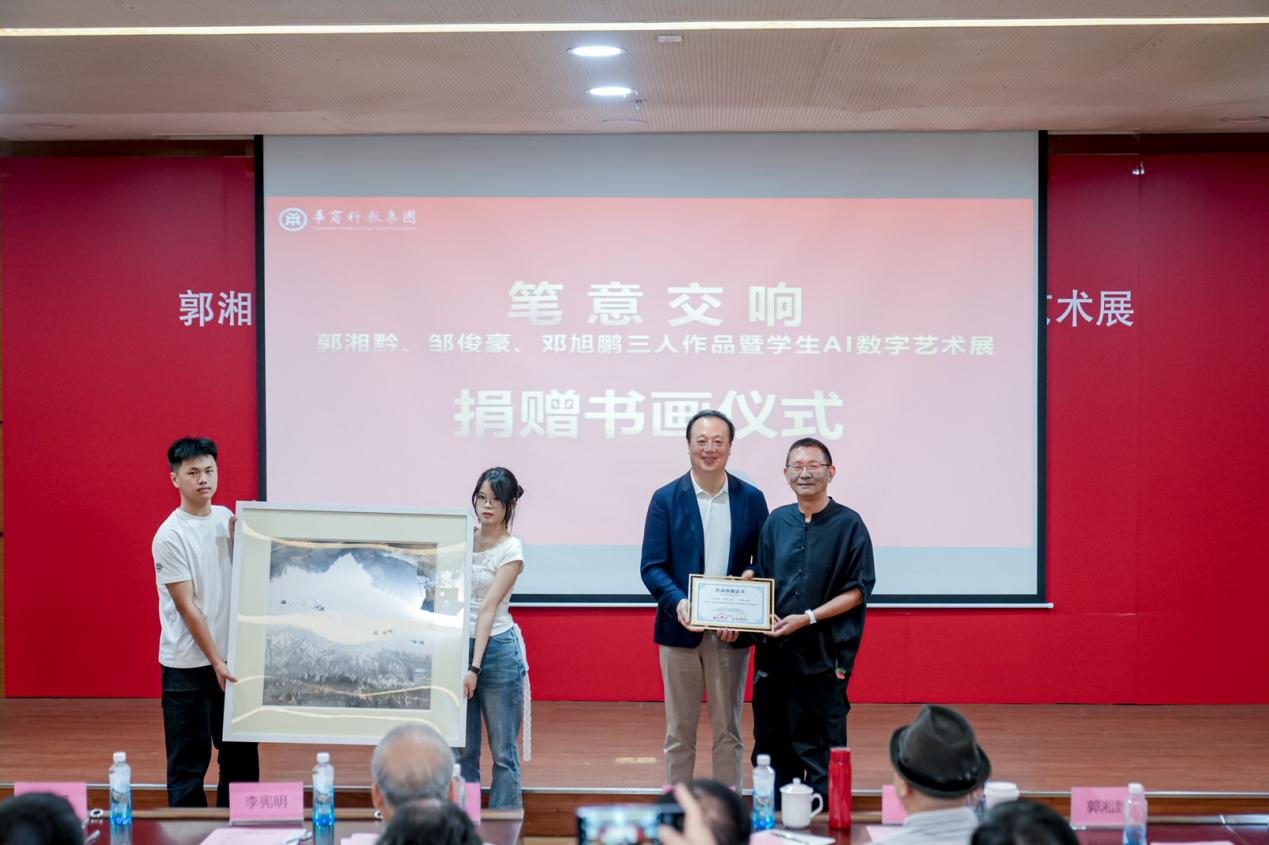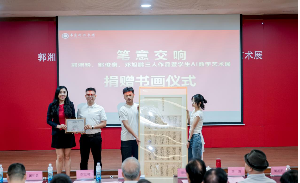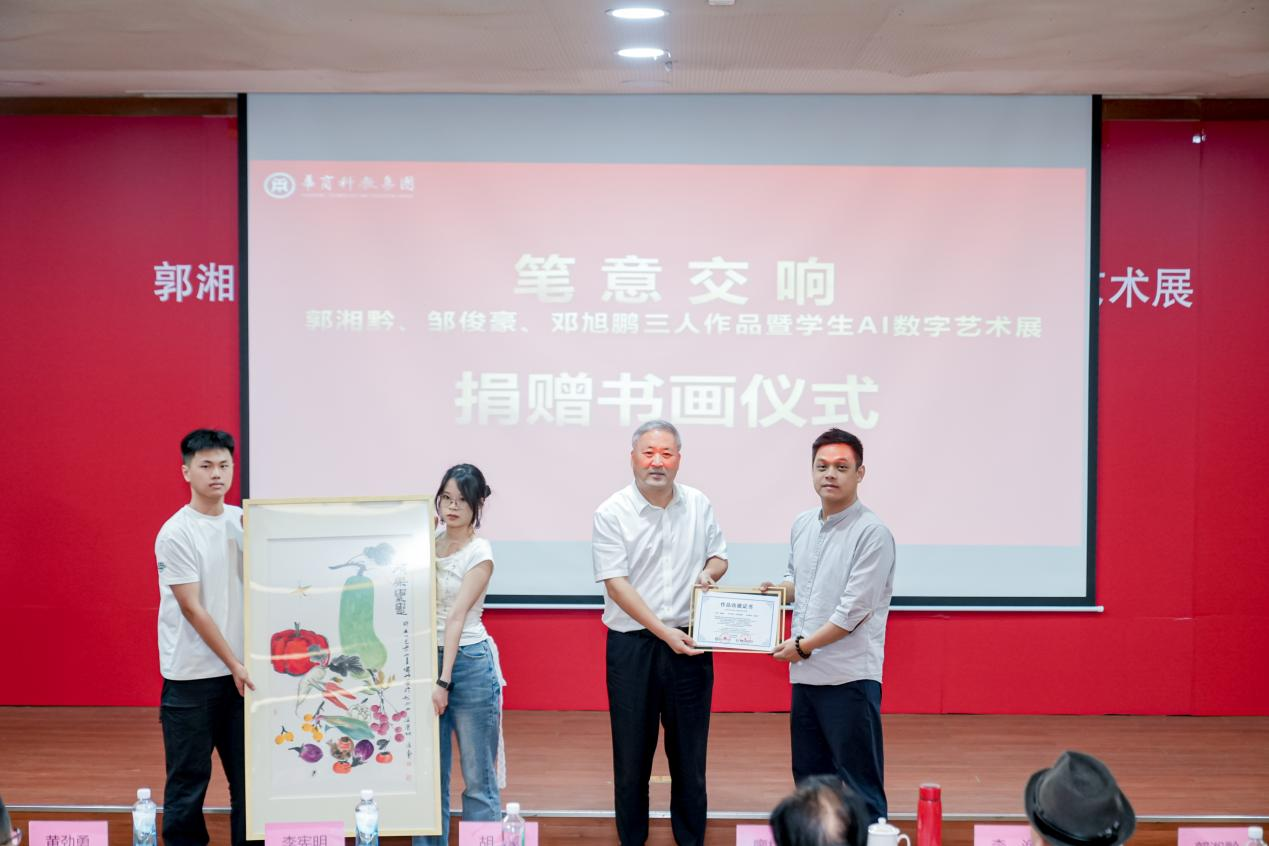 书画捐赠仪式:三位艺术家向学校捐赠了代表作品,为华商艺术教育注入新的文化底蕴。首先是郭湘黔教授的作品,作品名为《开天》,象征前所未有的开创、革新,代表打破旧有格局,开启全新的局面。这也寓意着在董事长的带领下,咱们华商学院能够不断突破创新,越办越好,实现办百年老校的远大目标!