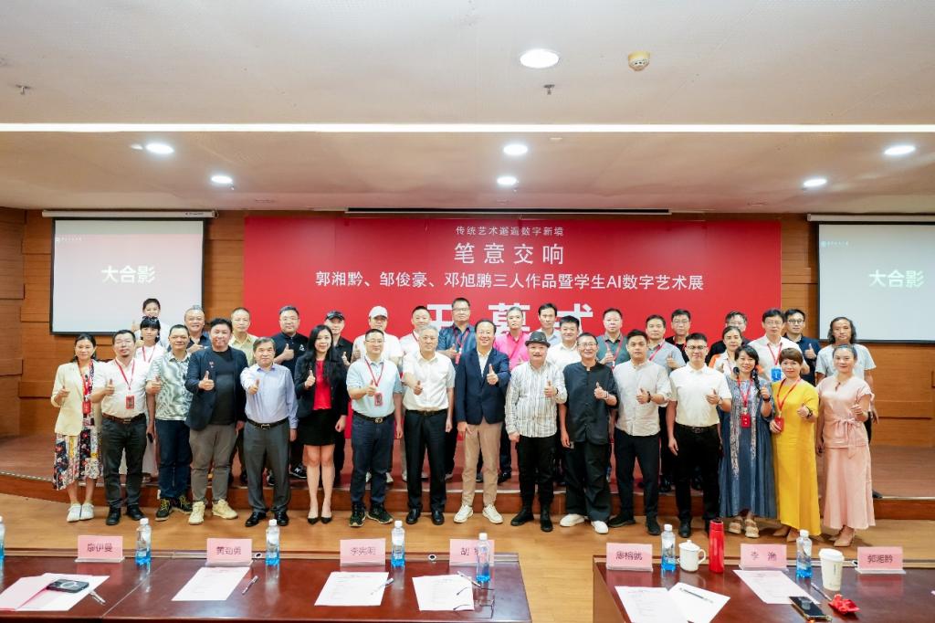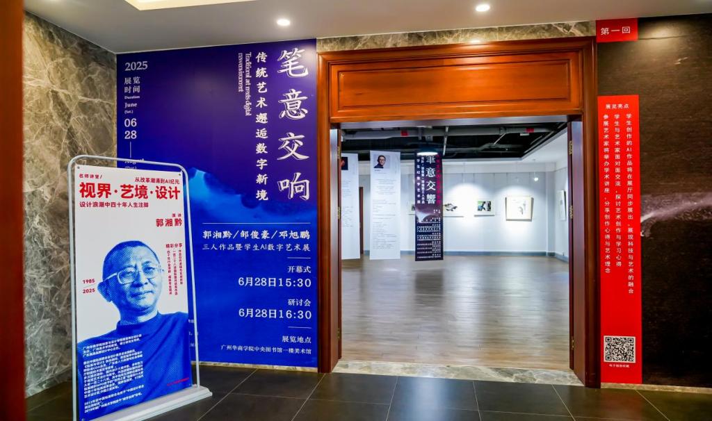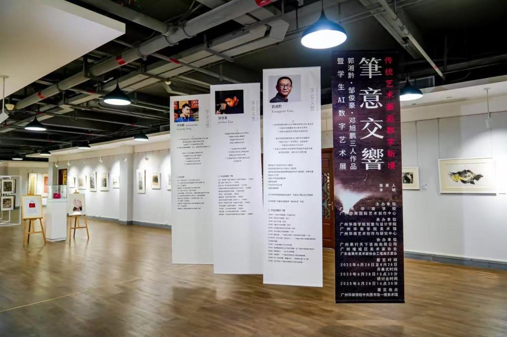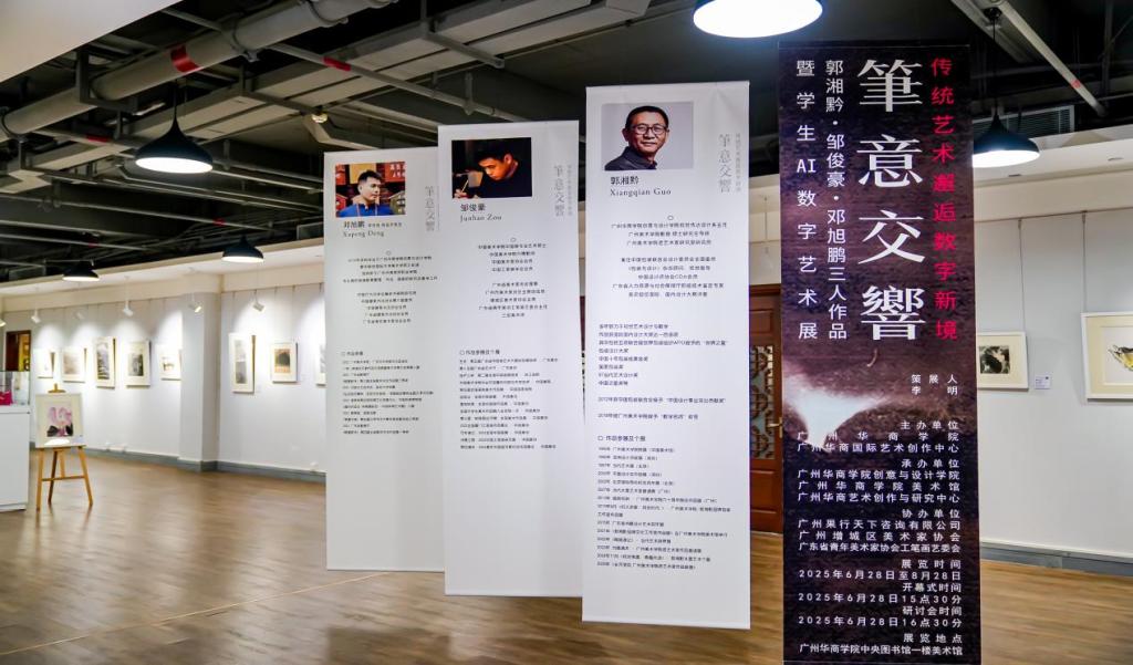 广州华商学院始终致力于推动艺术教育与科技创新的融合发展。6月28日,由我校创意与设计学院承办的"笔意交响"郭湘黔·邹俊豪·邓旭鹏三人作品暨学生AI数字艺术展在中央图书馆美术馆隆重开幕,这是学校推进"新文科"建设、探索艺术教育数字化转型的重要实践。展览通过传统水墨、工笔、书法与人工智能技术的创新融合,不仅展现了我校在艺术创作与数字技术交叉领域的前沿探索,更为师生搭建了高水平的艺术交流平台。