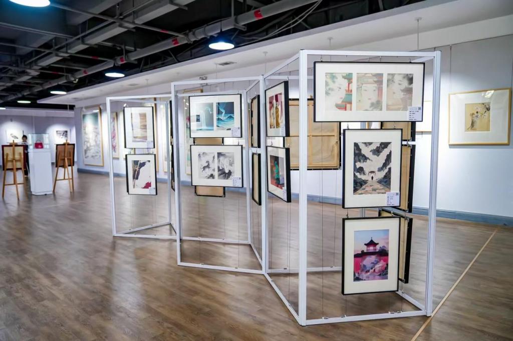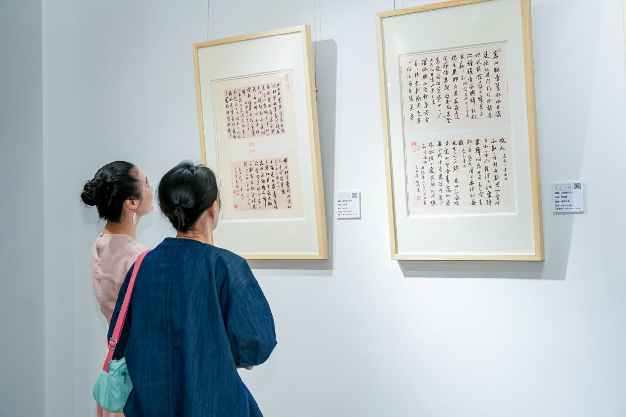 艺术家作品展区:郭湘黔的《丹霞》以空灵水墨勾勒出晨雾中的山水意境;邹俊豪的《家园》系列工笔画,金线交织间尽显花鸟虫兽的生命力;邓旭鹏的书法《艺概》笔走龙蛇,墨色浓淡相宜,令人叹服。学生AI数字艺术展区:科技感十足的AI创作展现了年轻一代对艺术的全新诠释,吸引观众驻足互动。