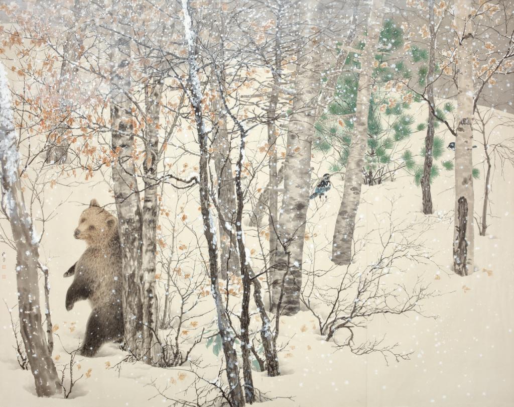 正午阳光为邹俊豪的《家园》工笔画织就金线,深耕工笔花鸟的他,尤擅动物绘画。笔下花鸟虫兽灵动鲜活,突破传统工笔的程式化窠臼,他以娴熟线条勾勒轮廓,借墨色晕染层次,或让动物直视画外形成冲击,或搭配花果聚焦中心,更以“画眼”构建观者与作品的共情桥梁,让传统工笔焕发新生。