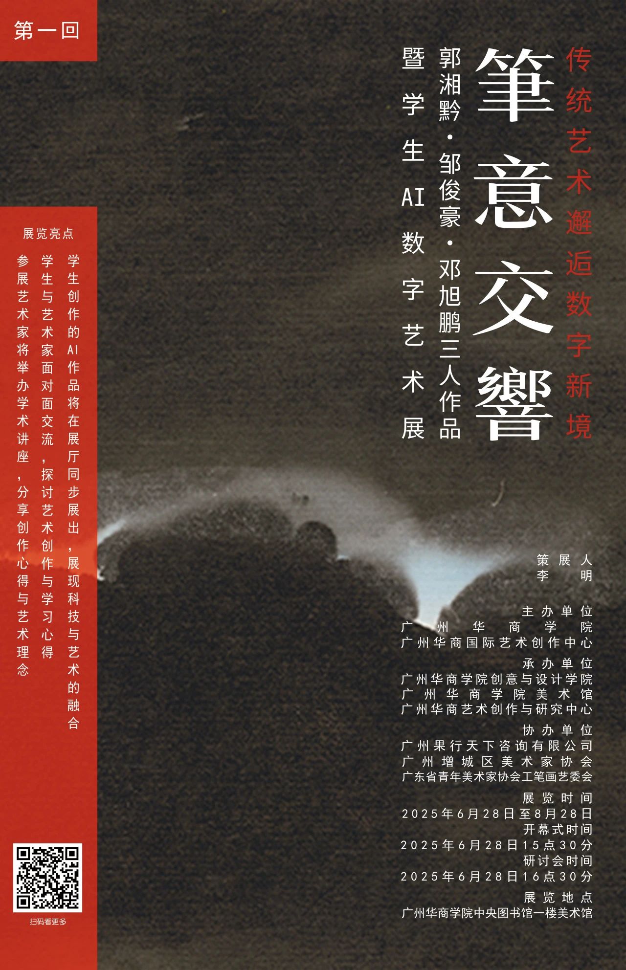 这是传统艺术与数字艺术的激情碰撞!在这里,您将看到艺术家的经典佳作,感受传统艺术历经岁月沉淀后的深厚底蕴;广州华商学院校友的创新之作,展现传统艺术在新时代的传承与拓展;广州华商学院学生们的创意作品,以青春视角和数字技术,为传统艺术赋予全新活力。