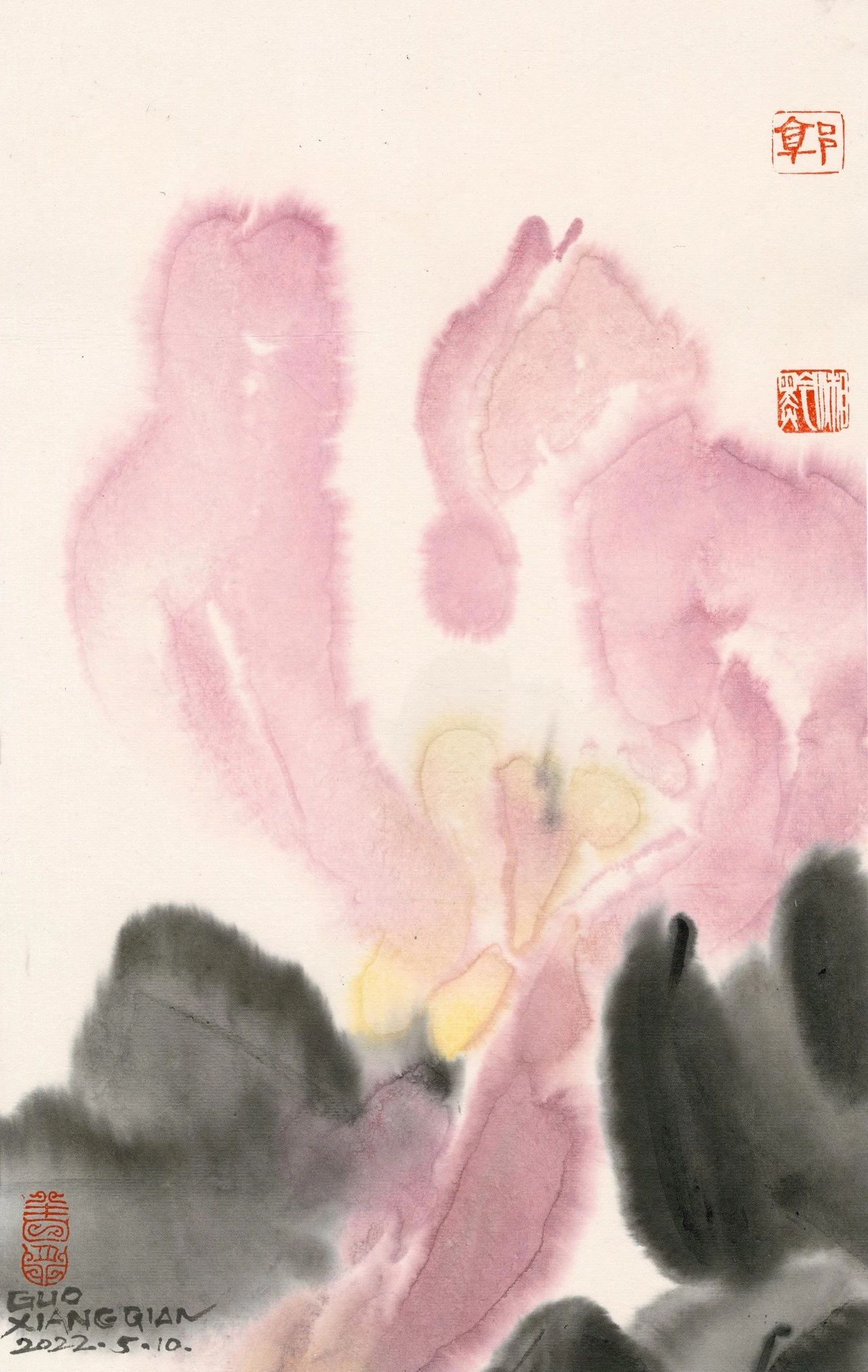笔墨是水墨之魂。郭湘黔以空灵写意的构图为核,融合传统与现代艺术理念,借宣纸特性生万千墨趣,以色彩烘托氛围,凭对称与留白赋予作品秩序与灵动。多年设计实践让他突破桎梏,将传统与现代、抽象与具象熔铸为独特的视觉语言。
