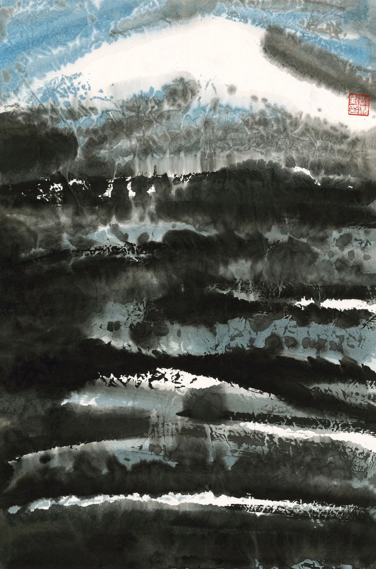 郭湘黔的《丹霞》在氤氲晨雾中铺展,墨香萦绕间,淡雅色彩于宣纸上层层晕染——水墨于他,是“纸上的云游”。偏爱宿墨的他,让历经沉淀的墨色兼具王维的悠远禅意与米芾的洒脱,笔锋扫过生宣化作雨幕,纸张微隆似承天际落雨,以黑白灰的变奏勾勒天地壮阔。