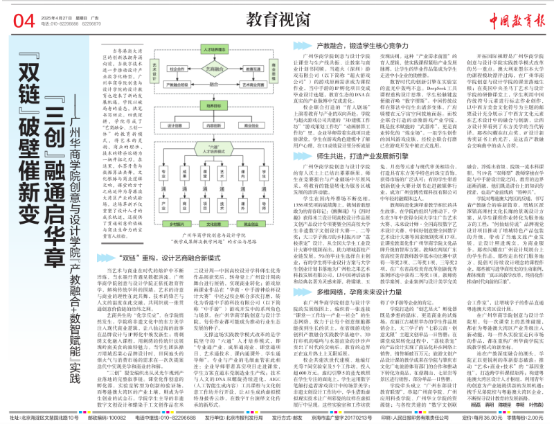 目前,我校创意与设计学院以"人工智能底层逻辑"为指引,通过"学科融合、产业跨界、资源联通"三大战略,成功将传统设计教育转型为智能时代的创意孵化平台,打造出"专业+产业+就业"三位一体的特色人才培养体系。此次得到主流媒体的报道,不仅是对该学院办学成果的肯定,更彰显了广州华商学院在深化产教融合、服务区域经济发展方面的示范作用。