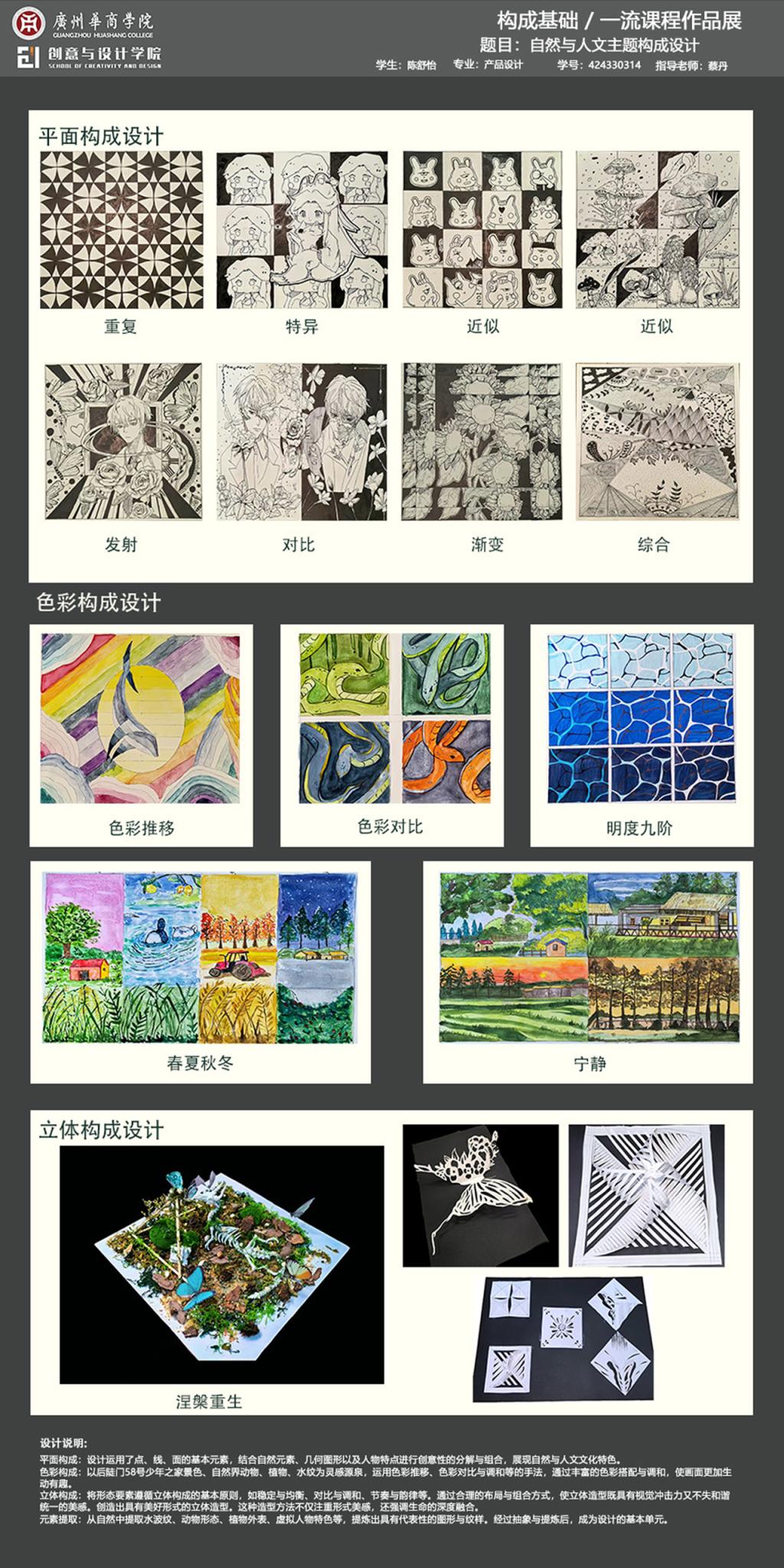本次展览是广州华商学院创意与设计学院校级一流课程《构成基础》的教学实践成果展示。作为融合产教协同育人理念的基础课程,面向数字媒体艺术、视觉传达设计、产品设计、环境设计专业,通过"基础理论-产业共建-创新实践"的教学模式,培养学生在设计创作中的视觉感知能力和产业表达能力。