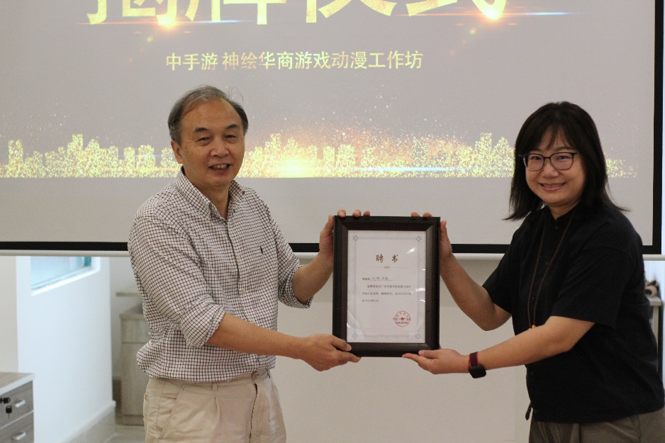 为促进双方合作与实践教学,广州华商学院创意与设计学院聘请中手游神绘公司总经理骆俊、美术总监刘畅担任 “行业导师”,王列耀副校长为其颁发聘书。