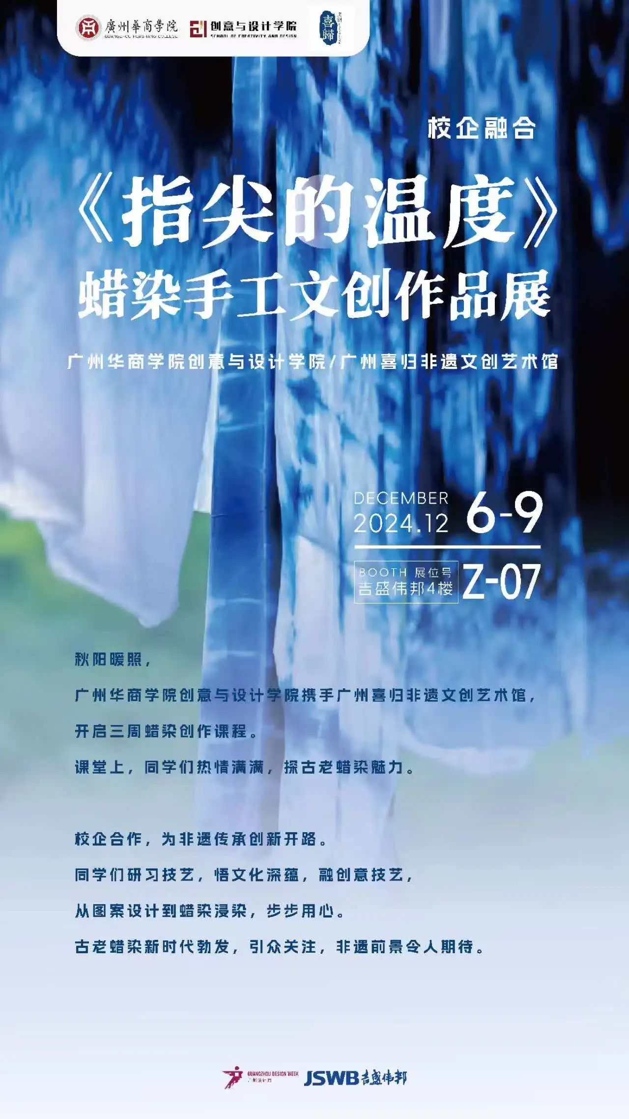 通过这一课程,22本视觉传达设计1班、2班、3班同学们走进蜡染非遗课堂,亲身参与了这一文化传承与创新的实践。值得一提的是,学生们的蜡染作品《指尖的温度》在2024广州设计周的专题展览中亮相,充分展示了校企合作与特色课程的深度融合及其对学生综合素质的提升。