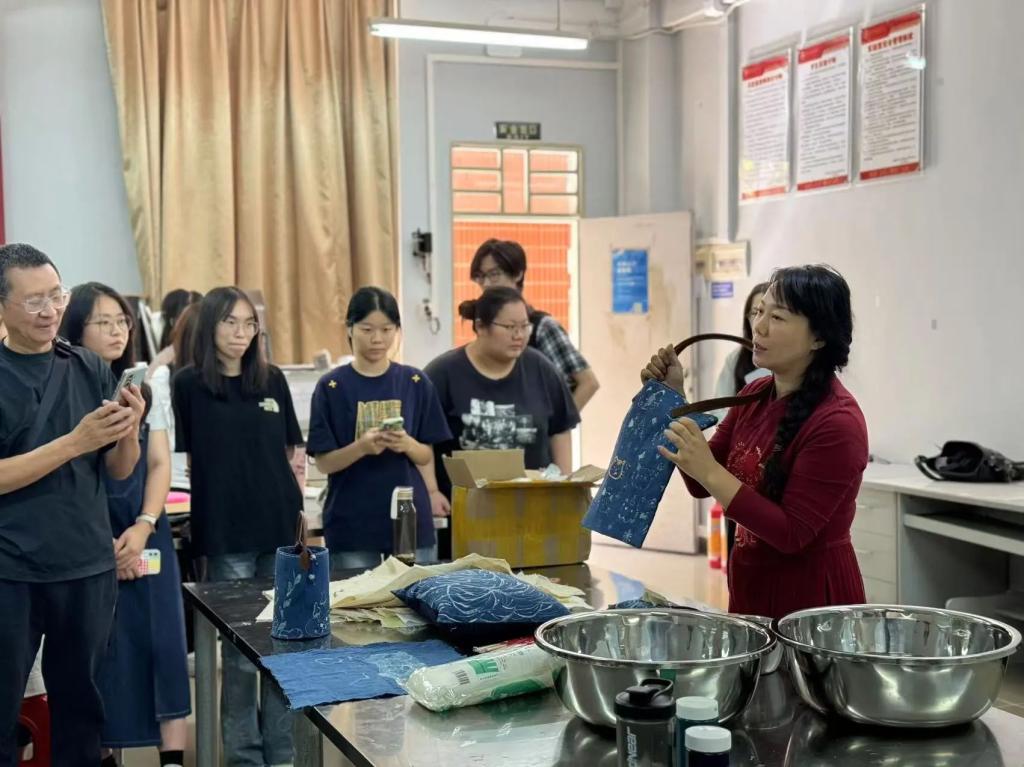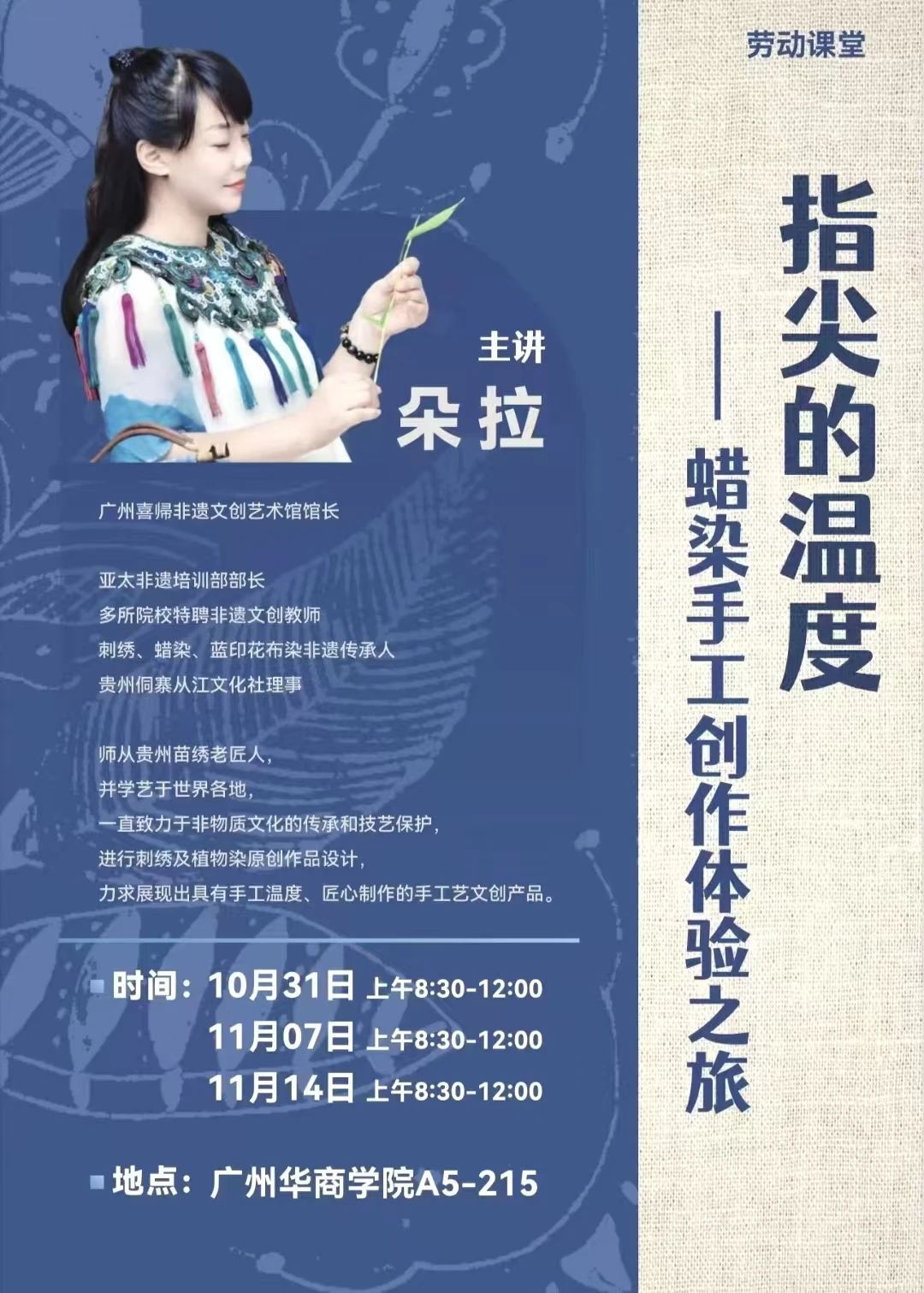 在此背景下,为了培养青年大学生对传统文化的热爱,更好地传承非遗文化,创意与设计学院郭湘黔教授带领视觉传达设计系,依托校企合作,推出了特色课程。此次课程联合广州喜归非遗文创艺术馆,开展了一项以提升学生动手能力和实践能力为目的的传统工艺蜡染手工创作体验活动,探索蜡染工艺与劳动教育的创新融合。