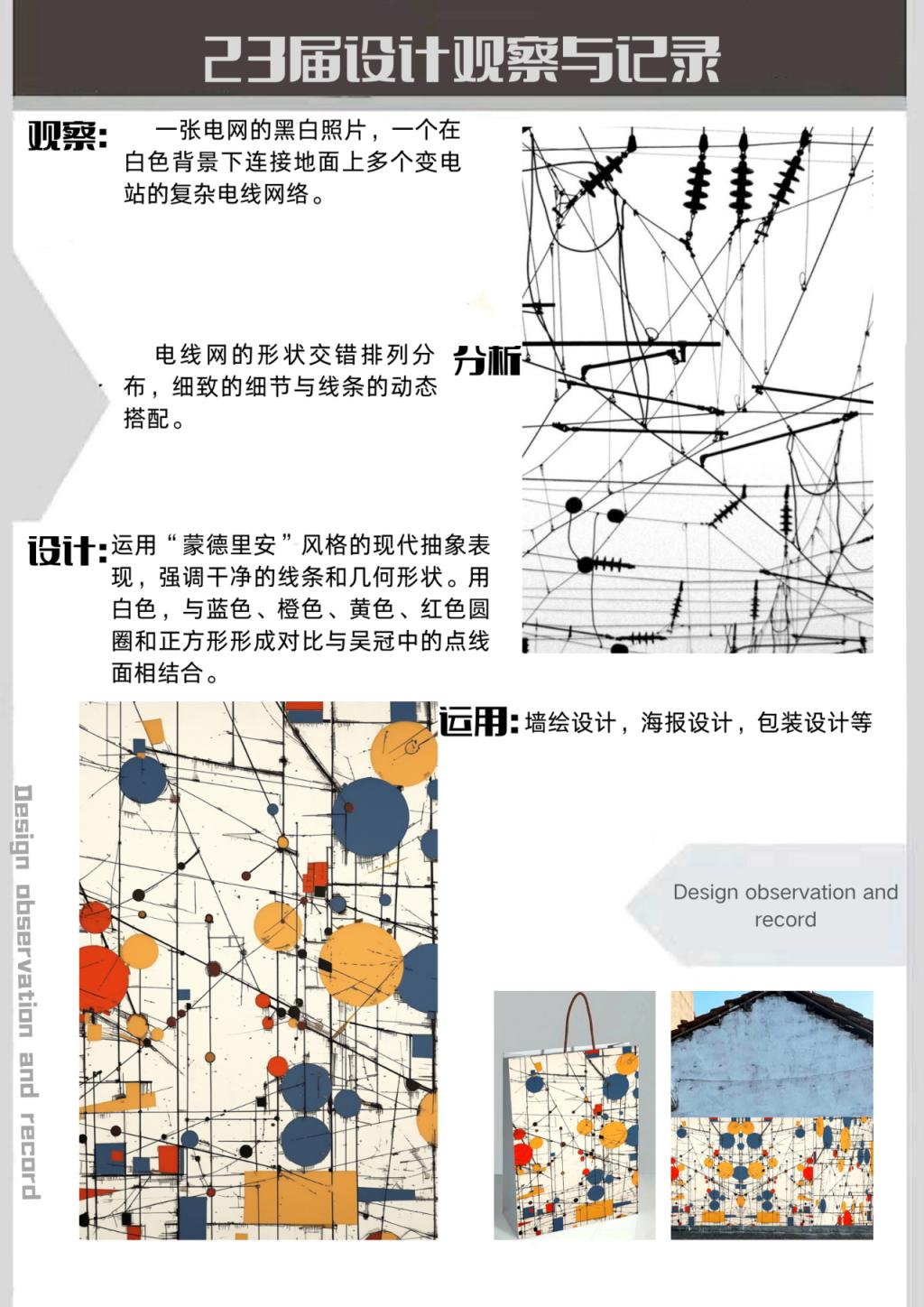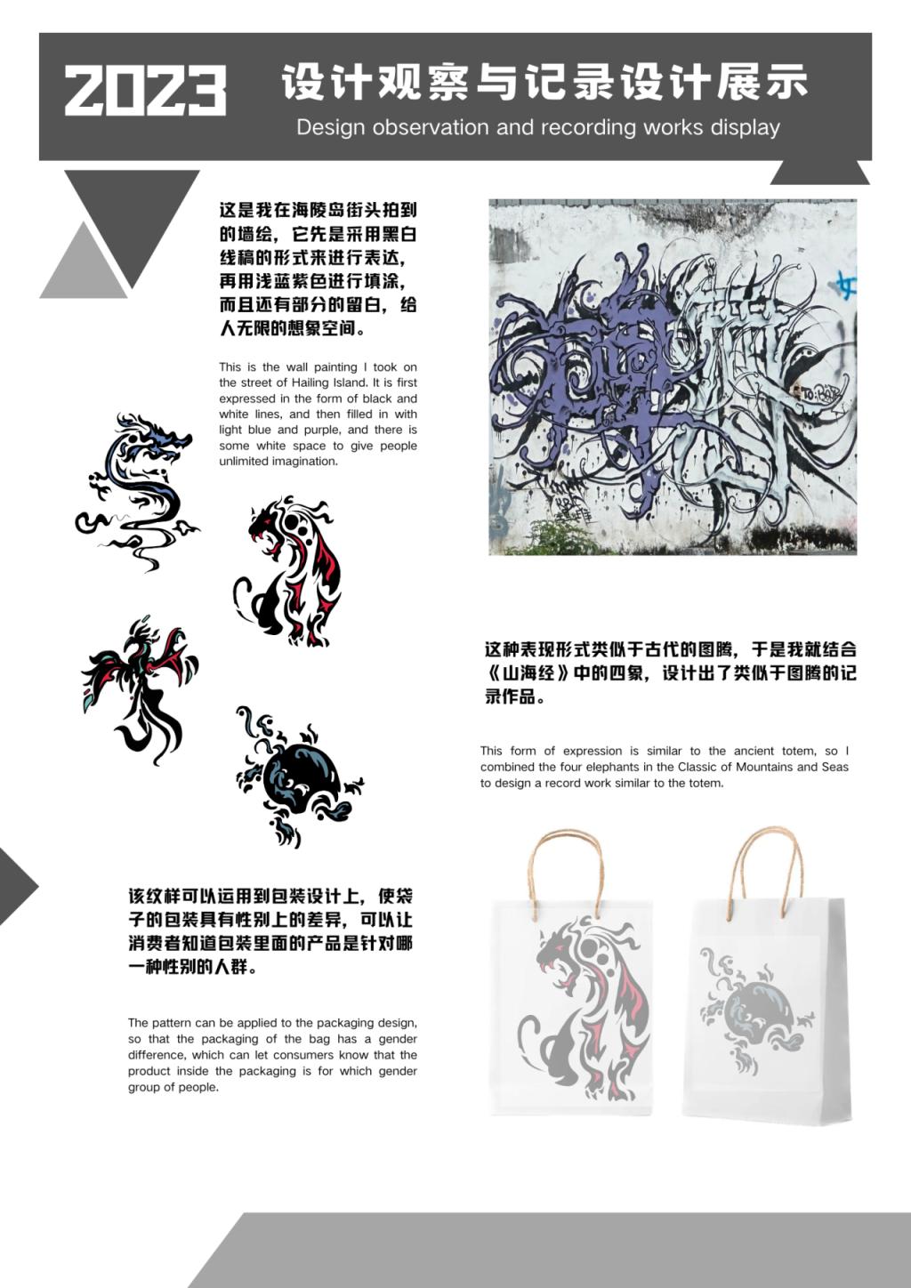 《设计观察与记录》课程秉承学院对实践教学的“两性一度”要求,课程优势在于它提供了一种设计方法论,从客观主体→设定主题→实地观察→元素记录→设计转换→应用形式与成果→设计主体,来训练设计思维转换度。通过观察和记录设计中的形式“发现”和元素“汲取”,学生们将能够更深入地理解设计的创作过程和设计师的思考方式。这将有助于学生们发展出自己独特的设计思维,并在今后的设计深入学习和实践中发挥更大的作用。